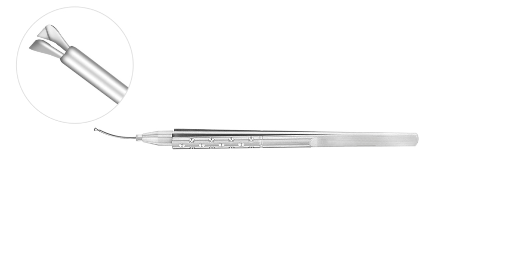 23 gauge curved shaft with short, micro grasping tips; designed for use through a very small paracentesis