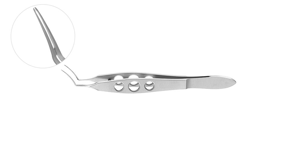 Donor lamella inserting forceps featuring thin vaulted 12mm long shanks and precalibrated heel stop to prevent tips from closing